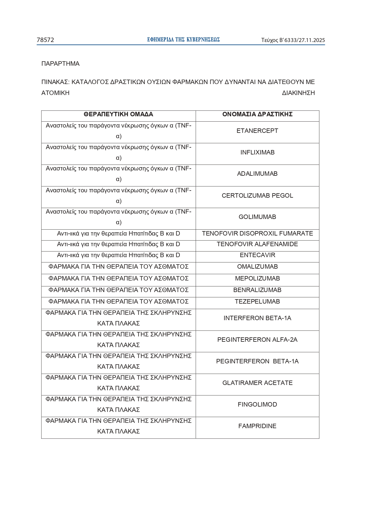 ΚΑΤΑΛΟΓΟΣ ΔΡΑΣΤΙΚΩΝ ΟΥΣΙΩΝ ΦΑΡΜΑΚΩΝ ΠΟΥ ΔΥΝΑΝΤΑΙ ΝΑ ΔΙΑΤΕΘΟΥΝ ΜΕ ΑΤΟΜΙΚΗ ΔΙΑΚΙΝΗΣΗ